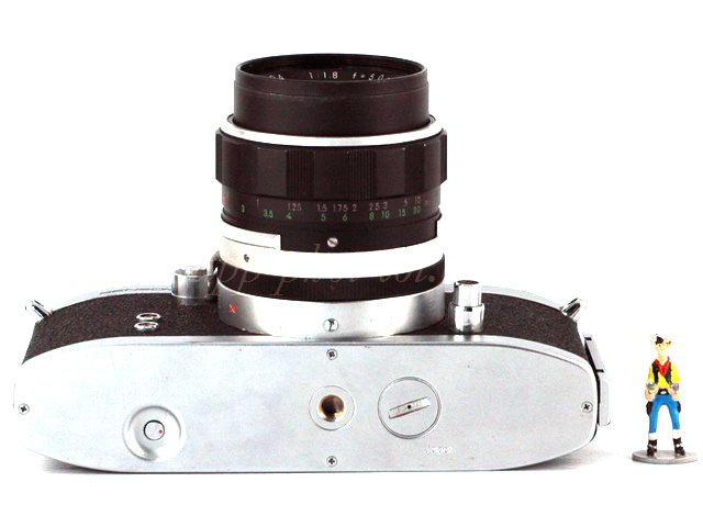 Dessous, le bouton de débrayage du film, l'écrou de pied, et le logement de la pile